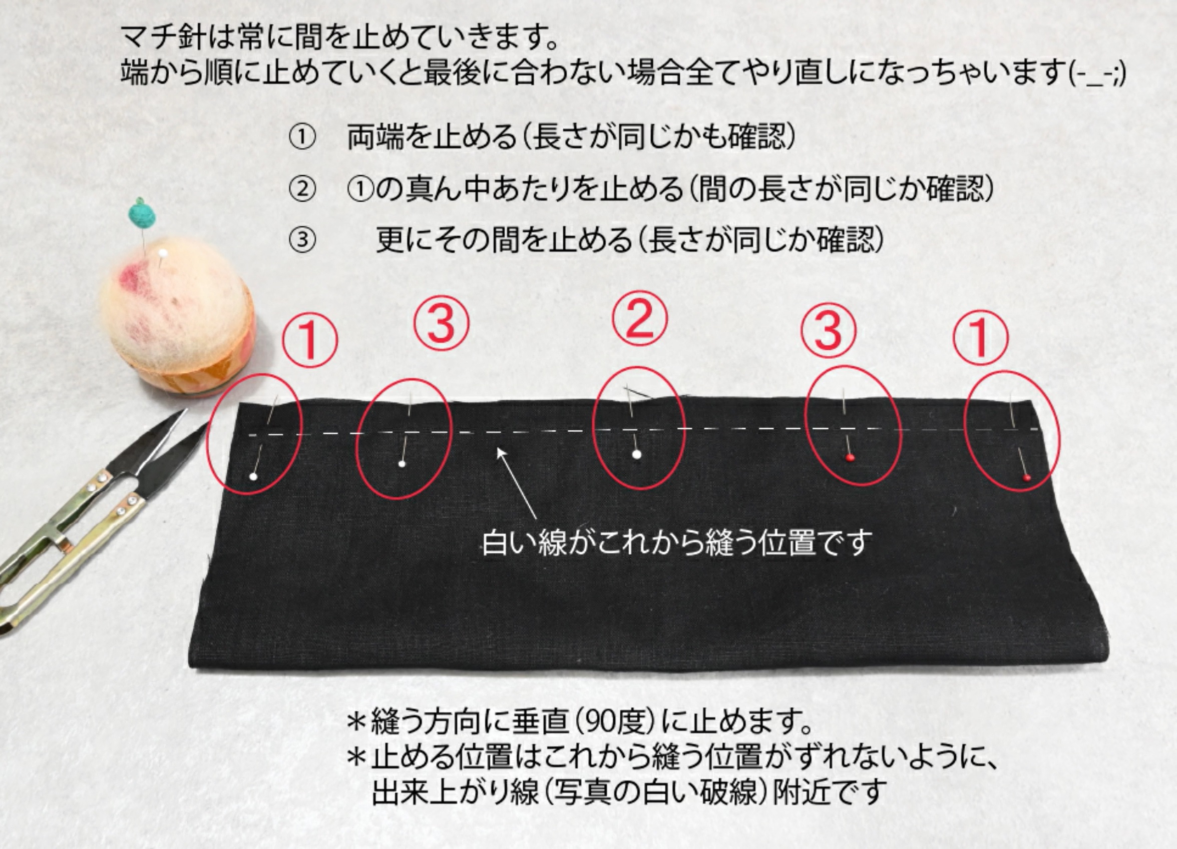 布の端をぴったり重ねる→両端をとめる→その中心をとめる→そのまた中心をとめる